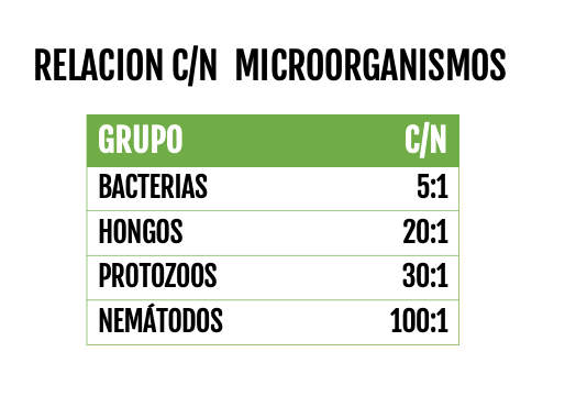 Por último, los microorganismos del suelo juegan un rol fundamental en la nutrición de las plantas. Veamos la relación C/N de algunos de ellos: