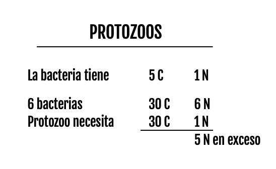Cuando un protozoo necesita para su nutrición, 30 átomos de carbono por cada átomo de nitrógeno, que los obtendrá de las bacterias, por lo que por cada 6 bacterias que consuma, eliminará 5 átomos de nitrógeno.
